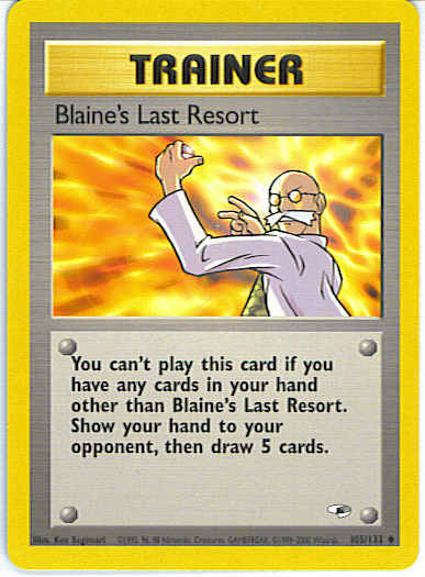 You can't play this card if you have any cards in your hand other than Blaine's Last Resort. Show your hand to your opponent, then draw 5 cards.