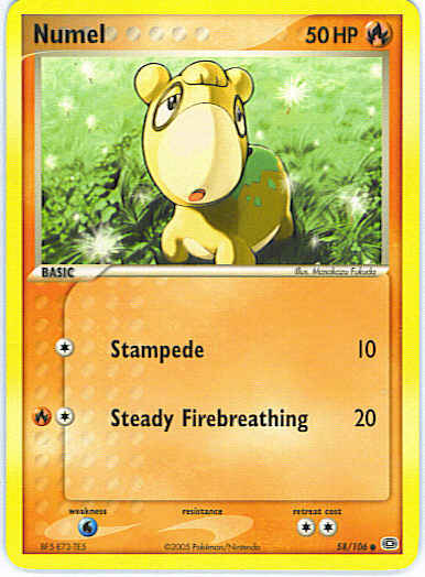 Type | Fire | Pokemon serie | Emerald | Stadie | Basic | HP | 50 | Sjældenhed | Common | Tilbagetrækning | 2 | Svaghed | W | Kortnummer | 58 | Evne | [C] Stampede (10) [CR] Steady Firebreathing (20) | Evne2 | [C] Stampede (10) [CR] Steady Firebreathing (20) | Kunstner | Masakazu Fukuda |
