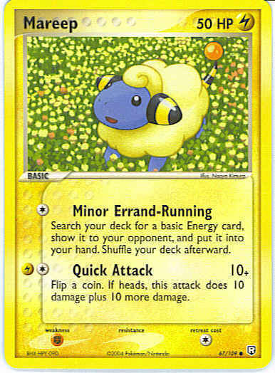Type | Lightning | Pokemon serie | Team Rocket Returns | Stadie | Basic | HP | 50 | Sjældenhed | Common | Tilbagetrækning | 1 | Svaghed | F | Kortnummer | 67 | Evne | [C] Minor Errand-Running - Search your deck for a basic Energy card, show it to your opponent, and put it into your hand. Shuffle your deck afterward. [CL] Quick Attack (10+) Flip a coin. If heads, this attack does 10 damage plus 10 more damage. | Evne2 | [C] Minor Errand-Running - Search your deck for a basic Energy card, show it to your opponent, and put it into your hand. Shuffle your deck afterward. [CL] Quick Attack (10+) Flip a coin. If heads, this attack does 10 damage plus 10 more damage. | Kunstner | Naoyo Kimura |