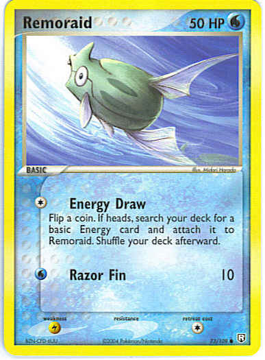 Type | Water | Pokemon serie | Team Rocket Returns | Stadie | Basic | HP | 50 | Sjældenhed | Common | Tilbagetrækning | 1 | Svaghed | L | Kortnummer | 73 | Evne | [C] Energy Draw - Flip a coin. If heads, search your deck for a basic Energy card and attach it to Remoraid. Shuffle your deck afterward. [W] Razor Fin (10) | Evne2 | [C] Energy Draw - Flip a coin. If heads, search your deck for a basic Energy card and attach it to Remoraid. Shuffle your deck afterward. [W] Razor Fin (10) | Kunstner | Midori Harada |
