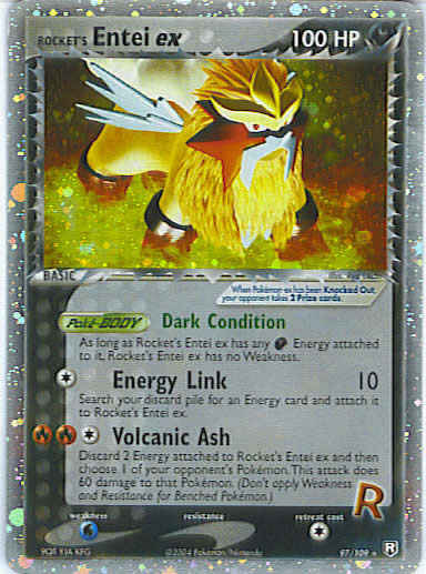 Evne | [C] Energy Link (10) Search you discard pile for an Energy card and attach it to Rocket's Entei ex. [CRR] Volcanic Ash - Discard 2 Energy attached to Rocket's Entei ex and then choose 1 of your opponent's Pokemon. This attack does 60 damage to that Pokemon. (Don't apply Weakness and Resistance for Benched Pokemon.) |