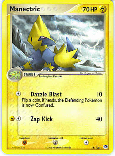 Type | Lightning | Pokemon serie | Emerald | Stadie | Stage 1 | HP | 70 | Sjældenhed | Rare | Tilbagetrækning | 1 | Modstand | M | Svaghed | F | Kortnummer | 16 | Evne |