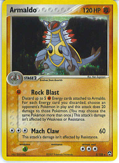 [F] Rock Blast - Discard up to 5 F Energy cards attached to Armaldo. For each Energy card you discarded, choose an opponent's Pokemon in play and this attack does 20 damage to those Pokemon. (You may choose the same Pokemon more than once.) This attack's damage isn't affected by Weakness or Resistance.