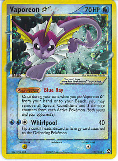 Type | Water | Pokemon serie | Power Keepers | Stadie | Basic | HP | 70 | Sjældenhed | Ultra-Rare | Tilbagetrækning | 1 | Svaghed | L | Kortnummer | 102 | Evne |
