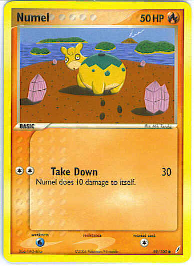 Type | Fire | Pokemon serie | Crystal Guardians | Stadie | Basic | HP | 50 | Sjældenhed | Common | Tilbagetrækning | 1 | Svaghed | W | Kortnummer | 59 | Evne | [CC] Take Down (30) Numel does 10 damage to itself. | Evne2 | [CC] Take Down (30) Numel does 10 damage to itself. | Kunstner | Miki Tanaka |