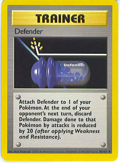 Evne Attach Defender to 1 of your Pokemon. At the end of your opponent's next turn, discard Defender. Damage done to that Pokemon by attacks is reduced by 20 (after applying Weakness and Resistance.)