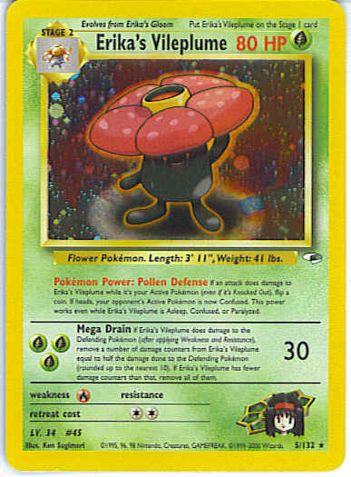 [GGG] Mega Drain (30) If Erika's Vileplume does damage to the Defending Pokemon (after applying Weakness and Resistance), remove a number of damage counters from Erika's Vileplume equal to half the damage done to the Defending Pokemon (rounded up to the nearest 10). If Erika's Vileplume has fewer damage counters than that, remove all of them.