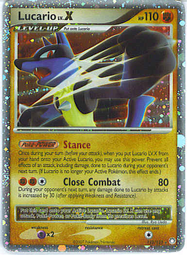 Type | Fighting | Pokemon serie | Mysterious Treasures | Stadie | Level Up | HP | 110 | Sjældenhed | Ultra-Rare | Tilbagetrækning | 1 | Svaghed | Px2 | Kortnummer | 122 | Evne | of an attack, including damage, done to Lucario during your opponent's next turn. (If Lucario is no longer your Active Pokemon, this effect ends.) (Poke-POWER)