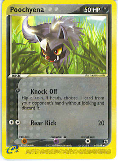 Type | Darkness | Pokemon serie | Ruby Sapphire | Stadie | Basic | HP | 50 | Sjældenhed | Common | Tilbagetrækning | 1 | Modstand | P | Svaghed | F | Kortnummer | 64 | Evne | [D] Knock Off - Flip a coin. If heads, choose 1 card from your opponent's hand without looking and discard it. [CC] Rear Kick (20)