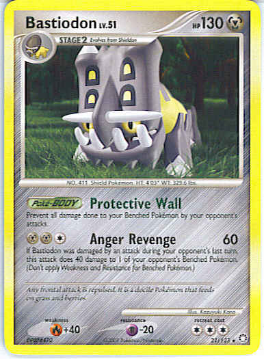 Evne [CMM] Anger Revenge (60) If Bastiodon was damaged by an attack during your opponent's last turn, this attack does 40 damage to 1 of your opponent's Benched Pokemon. (Don't apply Weakness and Resistance for Benched Pokemon.)