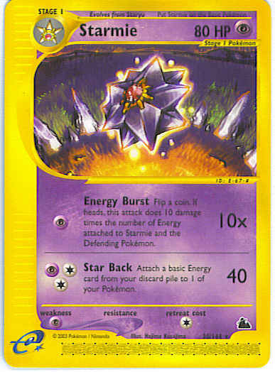 | Evne2 | [P] Energy Burst (10x) Flip a coin. If heads, this attack does 10 damage times the number of Energy cards attached to Starmie and the Defending Pokemon. [CCP] Star Back (40) Attach a basic Energy card from your discard pile to 1 of your Pokemon.