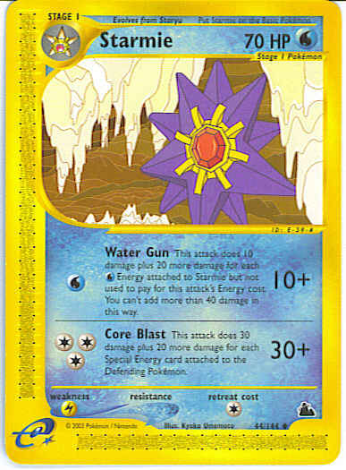 Evne | [W] Water Gun (10+) This attack does 10 damage plus 20 more damage for each W Energy attached to Starmie but not used to pay for this attack's energy cost. You can't add more than 40 damage in this way. [CCC] Core Blast (30+) This attack does 30 damage plus 20 more damage for each Special Energy card attached to the Defending Pokemon.