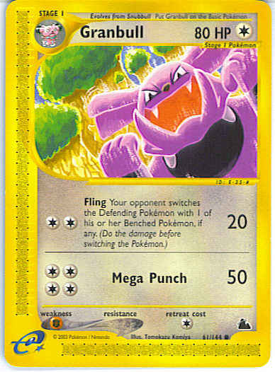 Type | Colorless | Pokemon serie | Skyridge | Stadie | Stage 1 | HP | 80 | Sjældenhed | Common | Tilbagetrækning | 1 | Svaghed | F | Kortnummer | 61 | Evne | [CC] Fling (20) Your opponent switches the Defending Pokemon with 1 of his or her Benched Pokemon. (Do the damage before switching the Pokemon.) [CCCC] Mega Punch (50)