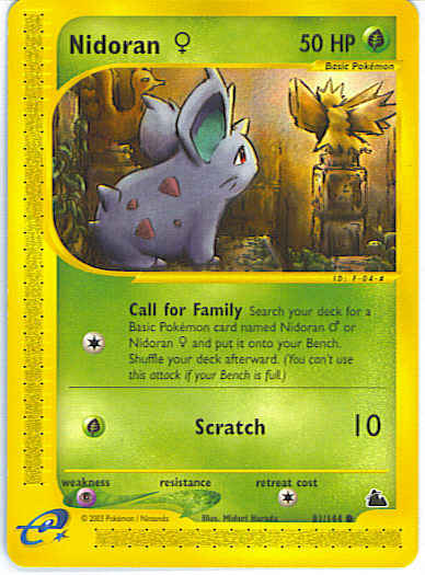 Type | Grass | Pokemon serie | Skyridge | Stadie | Basic | HP | 50 | Sjældenhed | Common | Tilbagetrækning | 1 | Svaghed | P | Kortnummer | 81 | Evne | [C] Call for Family - Search your deck for a Basic Pokemon card named Nidoran M or Nidoran F and put it onto your Bench. Shuffle your deck afterward. (You can't use this attack if your bench is full.) [G] Scratch (10)