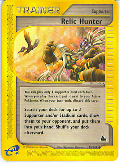 Type | Trainer | Pokemon serie | Skyridge | Stadie | Trainer (Supporter) | Sjældenhed | Uncommon | Kortnummer | 120 | Evne | Search your deck for up to 2 Supporter and/or Stadium cards, show them to your opponent, and put them into your hand. Shuffle your deck afterward.