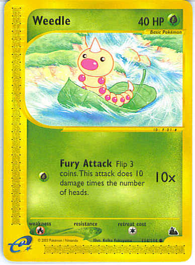Type | Grass | Pokemon serie | Skyridge | Stadie | Basic | HP | 40 | Sjældenhed | Common | Tilbagetrækning | 1 | Svaghed | R | Kortnummer | 114 | Evne | [G] Fury Attack (10x) Flip 3 coins. This attack does 10 damage times the number of heads.