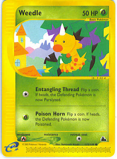 Type | Grass | Pokemon serie | Skyridge | Stadie | Basic | HP | 50 | Sjældenhed | Common | Tilbagetrækning | 1 | Svaghed | R | Kortnummer | 115 | Evne | [C] Entangling Thread - Flip a coin. If heads, the Defending Pokemon is now Paralyzed. [G] Poison Horn - Flip a coin. If heads, the Defending Pokemon is now Poisoned.