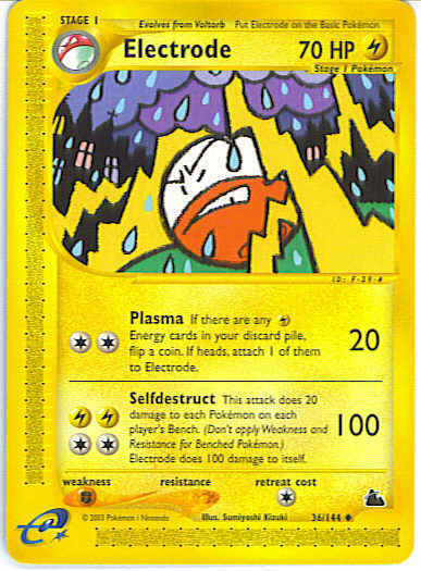 Type | Lightning | Pokemon serie | Skyridge | Stadie | Stage 1 | HP | 70 | Sjældenhed | Uncommon | Tilbagetrækning | 1 | Svaghed | F | Kortnummer | 36 | Evne | [CC] Plasma (20) If there are any L Energy cards in your discard pile, flip a coin. If heads, attach 1 of them to Electrode. [CCLL] Self destruct (100) This attack does 20 damage to each Pokemon on each player's bench. (Don't apply Weakness and Resistance for Benched Pokemon) Electrode does 100 damage to itself.