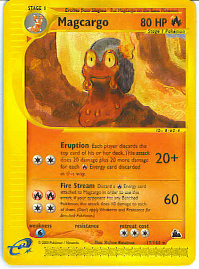 Type | Fire | Pokemon serie | Skyridge | Stadie | Stage 1 | HP | 80 | Sjældenhed | Rare | Tilbagetrækning | 3 | Svaghed | W | Kortnummer | 17 | Evne | [CC] Eruption (20+) Each player discards the top card of his or her deck. This attack does 20 damage plus 20 more damage for each R Energy card discarded in this way. [CCRR] Fire Stream (60) Discard a R Energy card attached to Magcargo in order to use this attack. If your opponent has any Benched Pokemon, this attack does 10 damage to each of them. (Don't apply Weakness or Resistance for Benched Pokemon.)