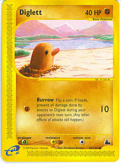 Type | Fighting | Pokemon serie | Skyridge | Stadie | Basic | HP | 40 | Sjældenhed | Common | Tilbagetrækning | 1 | Modstand | L | Svaghed | G | Kortnummer | 50 | Evne | [F] Burrow (10) Flip a coin. If heads, prevent all damage done by attacks to Diglett during your opponent's next turn. (Any other effects of attack still happen.)