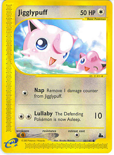 Type | Colorless | Pokemon serie | Skyridge | Stadie | Basic | HP | 50 | Sjældenhed | Common | Tilbagetrækning | 1 | Svaghed | F | Kortnummer | 68 | Evne | [C] Nap - Remove 1 damage counter from Jigglypuff [CC] Lullaby (10) The Defending Pokemon is now Asleep.