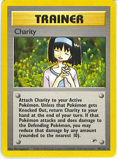 Attach Charity to your Active Pokemon. Unless that Pokemon gets Knocked Out, return Charity to your hand at the end of your turn. If that Pokemon attacks and does damage to the Defending Pokemon, you may reduce that damage by any amount (rounded to the nearest 10).