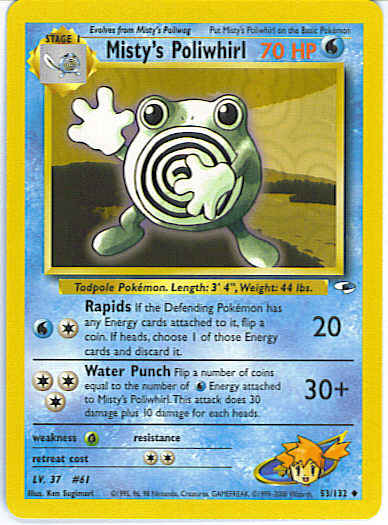 [CCC] Water Punch (30+) Flip a number of coins equal to the number of W Energy attached to Misty's Poliwhirl. This attack does 30 damage plus 10 damage for each heads.