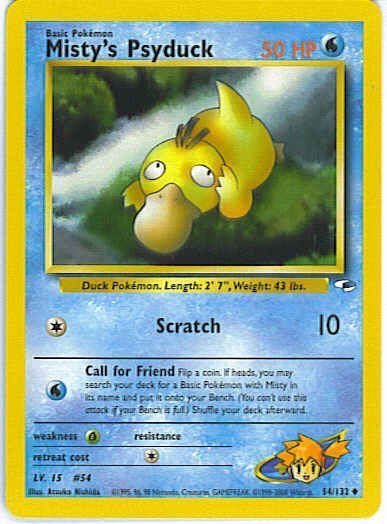 [W] Call for Friend - Flip a coin. If heads, you may search your deck for a Basic Pokemon with Misty in its name and put it onto your Bench. (You can't use this attack if your Bench is full.) Shuffle your deck afterward.