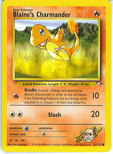 [R] Kindle (10) Discard 1 Energy card attached to Blaine's Charmander in order to use this attack. If the Defending Pokemon has any Energy cards attached to it, choose 1 of them and discard it.