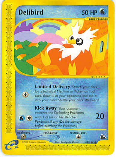 Type | Water | Pokemon serie | Skyridge | Stadie | Basic | HP | 50 | Sjældenhed | Common | Tilbagetrækning | 1 | Svaghed | M | Kortnummer | 49 | Evne | [C] Limited Delivery - Search your deck for a Technical Machine or Pokemon Tool card show it to your opponent, and put it into your hand. Shuffle your deck afterward. [CW] Kick Away (20) Your opponent switches the Defending Pokemon with 1 of his or her Benched Pokemon, if any. (Do the damage before switching Pokemon.)