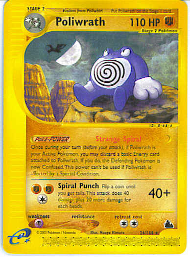 Type | Fighting | Pokemon serie | Skyridge | Stadie | Stage 2 | HP | 110 | Sjældenhed | Rare | Tilbagetrækning | 2 | Svaghed | P | Kortnummer | 26 | Evne | [CFF] Spiral Punch (40+) Flip a coin until you get tails. This attack does 40 damage plus 20 more damage for each heads.