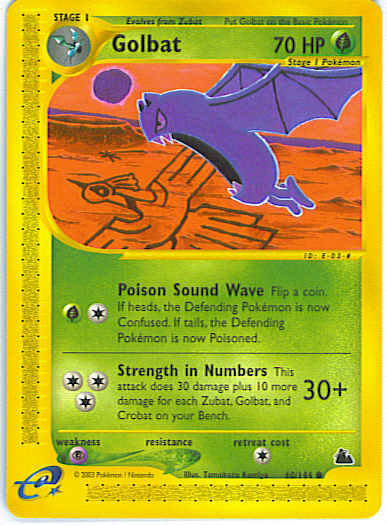 | Evne2 | [CG] Poison Sound Wave - Flip a coin. If heads, the Defending Pokemon is now Confused. If tails, the Defending Pokemon is now Poisoned. [CCC] Strength in Numbers (30+) This attack does 30 damage plus 10 more damage for each Zubat, Golbat, and Crobat on your bench.