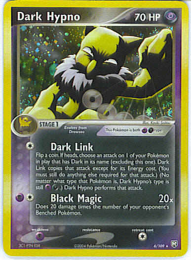 [C] Dark Link - Flip a coin. If heads, choose an attack on 1 of your Pokemon in play that has Dark in its name (excluding this one). Dark Link copies that attack except for its Energy cost. (You must still do anything else required for that attack.) (No matter what type that Pokemon is, Dark Hypno's type is still Psychic and Dark.) Dark Hypno performs that attack.