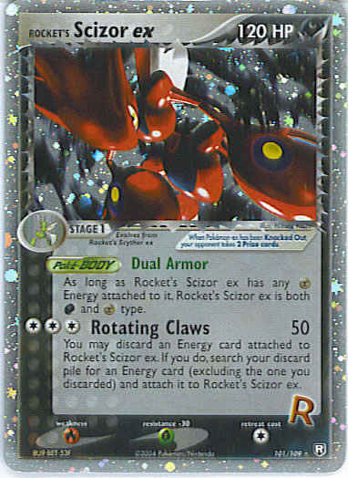 Type | Darkness | Pokemon serie | Team Rocket Returns | Stadie | Stage 1 | HP | 120 | Sjældenhed | Ultra-Rare | Tilbagetrækning | 1 | Modstand | G | Svaghed | R | Kortnummer | 101 | Evne | [CCC] Rotating Claws (50) You may discard an Energy card attached to Rocket's Scizor ex. If you do, search your discard pile for an Energy card (excluding the one your discarded) and attach it to Rocket's Scizor ex. | Evne2 | [CCC] Rotating Claws (50) You may discard an Energy card attached to Rocket's Scizor ex. If you do, search your discard pile for an Energy card (excluding the one your discarded) and attach it to Rocket's Scizor ex. | Kunstner | Hikaru Koike |