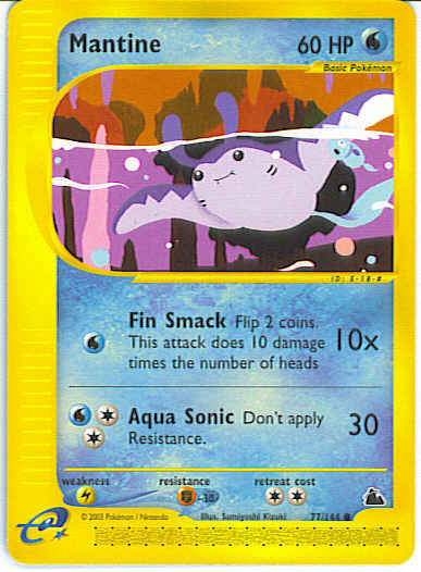 Type | Water | Pokemon serie | Skyridge | Stadie | Basic | HP | 60 | Sjældenhed | Common | Tilbagetrækning | 2 | Modstand | F | Svaghed | L | Kortnummer | 77 | Evne | [W] Fin Smack (10x) Flip 2 coins. This attack does 10 damage times the number of heads. [CCW] Aqua Sonic (30) Don't apply Weakness and Resistance.