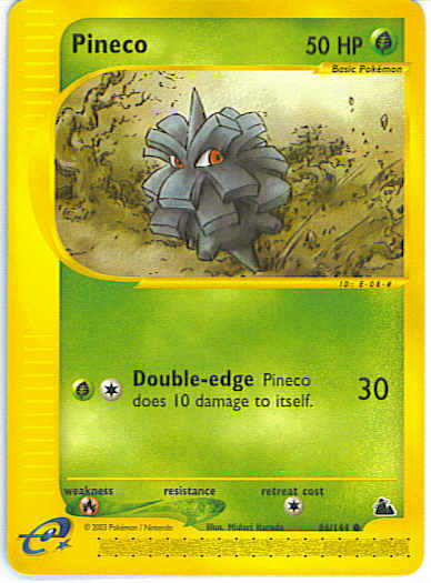 Type | Grass | Pokemon serie | Skyridge | Stadie | Basic | HP | 50 | Sjældenhed | Common | Svaghed | R | Kortnummer | 86 | Evne | [CG] Double-edge (30) Pineco does 10 damage to itself.