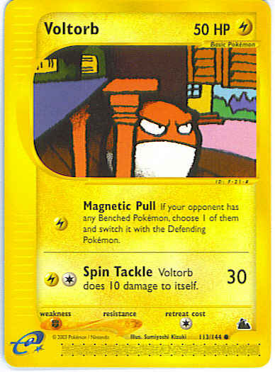 Type | Lightning | Pokemon serie | Skyridge | Stadie | Basic | HP | 50 | Sjældenhed | Common | Tilbagetrækning | 1 | Svaghed | F | Kortnummer | 113 | Evne | [L] Magnetic Pull - If your opponent has any Benched Pokemon, choose 1 of them and switch it with the Defending Pokemon. [CL] Spin Tackle (30) Voltorb does 10 damage to itself.