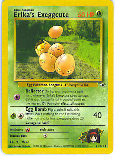 [CG] Egg Bomb (40) Flip a coin. If tails, this attack does nothing to the Defending Pokemon and Erika's Exeggcute does 20 damage to itself.