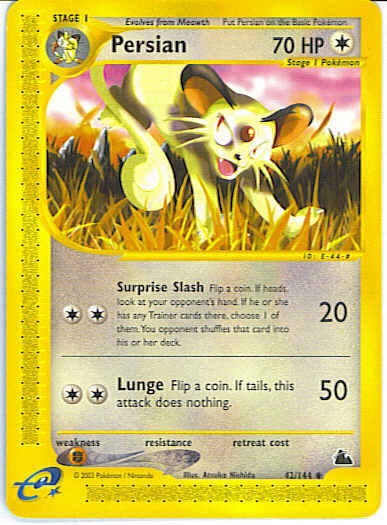 Type | Colorless | Pokemon serie | Skyridge | Stadie | Stage 1 | HP | 70 | Sjældenhed | Uncommon | Svaghed | F | Kortnummer | 42 | Evne | [CC] Surprise Slash (20) Flip a coin. If heads look at your opponent's hand. If he or she has any Trainer cards there, choose 1 of them. Your opponent shuffles that card into his or her deck. [CC] Lunge (50) Flip a coin. If tails, this attack does nothing.