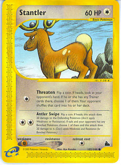 Type | Colorless | Pokemon serie | Skyridge | Stadie | Basic | HP | 60 | Sjældenhed | Common | Tilbagetrækning | 1 | Svaghed | F | Kortnummer | 102 | Evne | [C] Threaten - Flip a coin. If heads, look at your opponent's hand. If he or she has any Trainer cards there, choose 1 of them. Your opponent shuffles that card back into his or her deck. [CC] Antler Swipe - Flip a coin. If heads, this attack does 20 damage to the Defending Pokemon (Don't apply Weakness and Resistance) If tails, your and opponent has any Benched Pokemon, choose 1 of them and this attack does 20 damage to it. (Don't apply Weakness and Resistance for Benched Pokemon.)