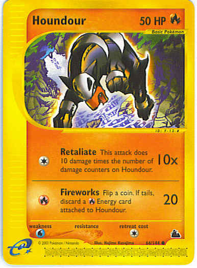 | Evne2 | [C] Retaliate (10x) This attack does 10 damage times the number of damage counters on Houndour. [R] Fireworks (20) Flip a coin. If tails, discard a R Energy card attached to Houndour.