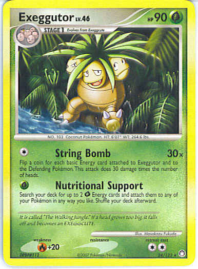 Evne [C] String Bomb - Flip a coin for each basic Energy card attached to Exeggutor and to the Defending Pokemon. This attack does 30 damage time the number of heads.