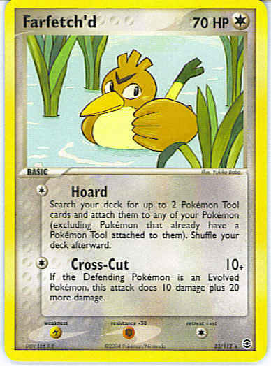 Type | Colorless | Pokemon serie | Fire Red Leaf Green | Stadie | Basic | HP | 70 | Sjældenhed | Rare | Tilbagetrækning | 1 | Modstand | F | Svaghed | L | Kortnummer | 23 | Evne | [C] Hoard - Search your deck for up to 2 Pokemon Tool cards and attach them to any of your Pokemon (excluding Pokemon that already have a Pokemon Tool attached to them). Shuffle your deck afterward. [C] Cross-Cut (10+) If the Defending Pokemon is an Evolved Pokemon, this attack does 10 damage plus 20 more damage. | Evne2 | [C] Hoard - Search your deck for up to 2 Pokemon Tool cards and attach them to any of your Pokemon (excluding Pokemon that already have a Pokemon Tool attached to them). Shuffle your deck afterward. [C] Cross-Cut (10+) If the Defending Pokemon is an Evolved Pokemon, this attack does 10 damage plus 20 more damage. | Kunstner | Yukiko Baba |