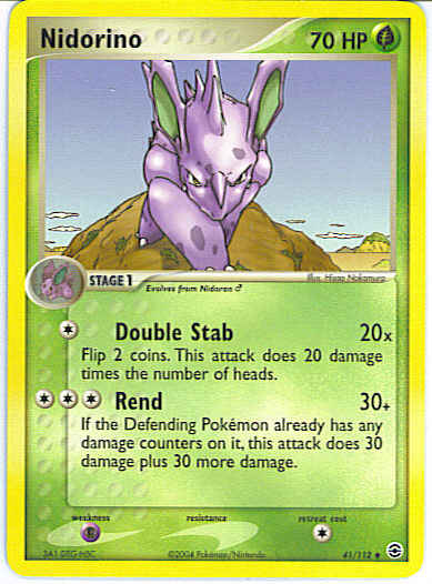 Type | Grass | Pokemon serie | Fire Red Leaf Green | Stadie | Stage 1 | HP | 70 | Sjældenhed | Uncommon | Tilbagetrækning | 1 | Svaghed | P | Kortnummer | 41 | Evne | [C] Double Stab (20x) Flip 2 coins. This attack does 20 damage times the number of heads. [CCC] Rend (30+) If the Defending Pokemon already has any damage counters on it, this attack does 30 damage plus 30 more damage. | Evne2 | [C] Double Stab (20x) Flip 2 coins. This attack does 20 damage times the number of heads. [CCC] Rend (30+) If the Defending Pokemon already has any damage counters on it, this attack does 30 damage plus 30 more damage. | Kunstner | Hisao Nakamura |