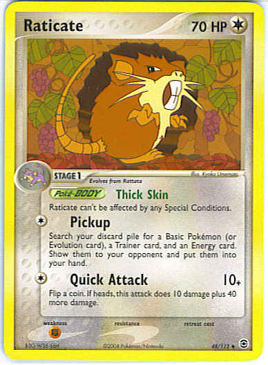 Type | Colorless | Pokemon serie | Fire Red Leaf Green | Stadie | Stage 1 | HP | 70 | Sjældenhed | Uncommon | Svaghed | F | Kortnummer | 48 | Evne | [C] Pickup - Search your discard pile for a Basic Pokemon (or Evolution card), a Trainer card, and an Energy card. Show them to your opponent and put them into your hand. [C] Quick Attack (10+) Flip a coin. If heads, this attack does 10 damage plus 40 more damage. | Evne2 | [C] Pickup - Search your discard pile for a Basic Pokemon (or Evolution card), a Trainer card, and an Energy card. Show them to your opponent and put them into your hand. [C] Quick Attack (10+) Flip a coin. If heads, this attack does 10 damage plus 40 more damage. | Kunstner | Kyoko Umemoto |