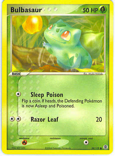 Type | Grass | Pokemon serie | Fire Red Leaf Green | Stadie | Basic | HP | 50 | Sjældenhed | Common | Tilbagetrækning | 1 | Svaghed | R | Kortnummer | 54 | Evne | [C] Sleep Poison - Flip a coin. If heads, the Defending Pokemon is now Asleep and Poisoned. [CC] Razor Leaf (20) | Evne2 | [C] Sleep Poison - Flip a coin. If heads, the Defending Pokemon is now Asleep and Poisoned. [CC] Razor Leaf (20) | Kunstner | Atsuko Nishida |