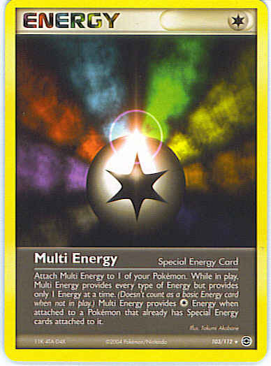 Attach Multi Energy to 1 of your Pokemon. While in play, Multi Energy provides every type of Energy but provides only 1 energy at a time. (Doesn't count as a basic Energy card when not in play.) Multi Energy provides C Energy when attached to a Pokemon that already has Special Energy cards attached to it.