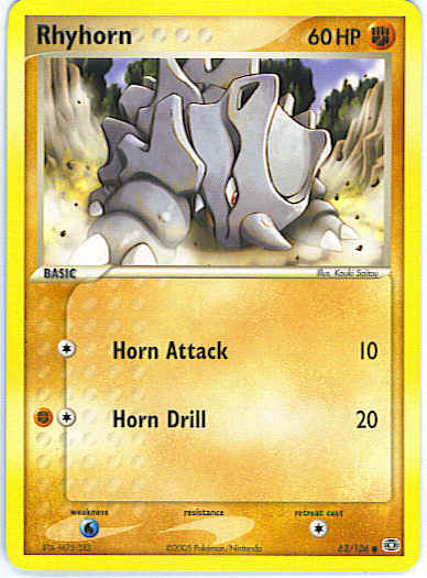 Type | Fighting | Pokemon serie | Emerald | Stadie | Basic | HP | 60 | Sjældenhed | Common | Tilbagetrækning | 1 | Svaghed | W | Kortnummer | 62 | Evne | [C] Horn Attack (10) [CF] Horn Drill (20) | Evne2 | [C] Horn Attack (10) [CF] Horn Drill (20) | Kunstner | Kouki Saitou |