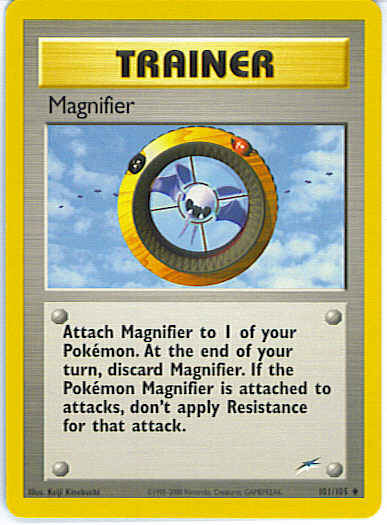 Evne2 Attach Magnifier to 1 of your Pokemon. At the end of your turn, discard Magnifier. If the Pokemon Magnifier is attached to attacks, don't apply Resistance for that attack.