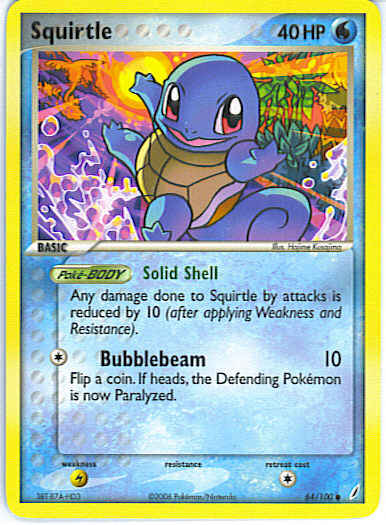 Type | Water | Pokemon serie | Crystal Guardians | Stadie | Basic | HP | 40 | Sjældenhed | Common | Tilbagetrækning | 1 | Svaghed | L | Kortnummer | 64 | Evne | [C] Bubblebeam (10) Flip a coin. If heads, the Defending Pokemon is now Paralyzed. | Evne2 | [C] Bubblebeam (10) Flip a coin. If heads, the Defending Pokemon is now Paralyzed. | Kunstner | Hajime Kusajima |